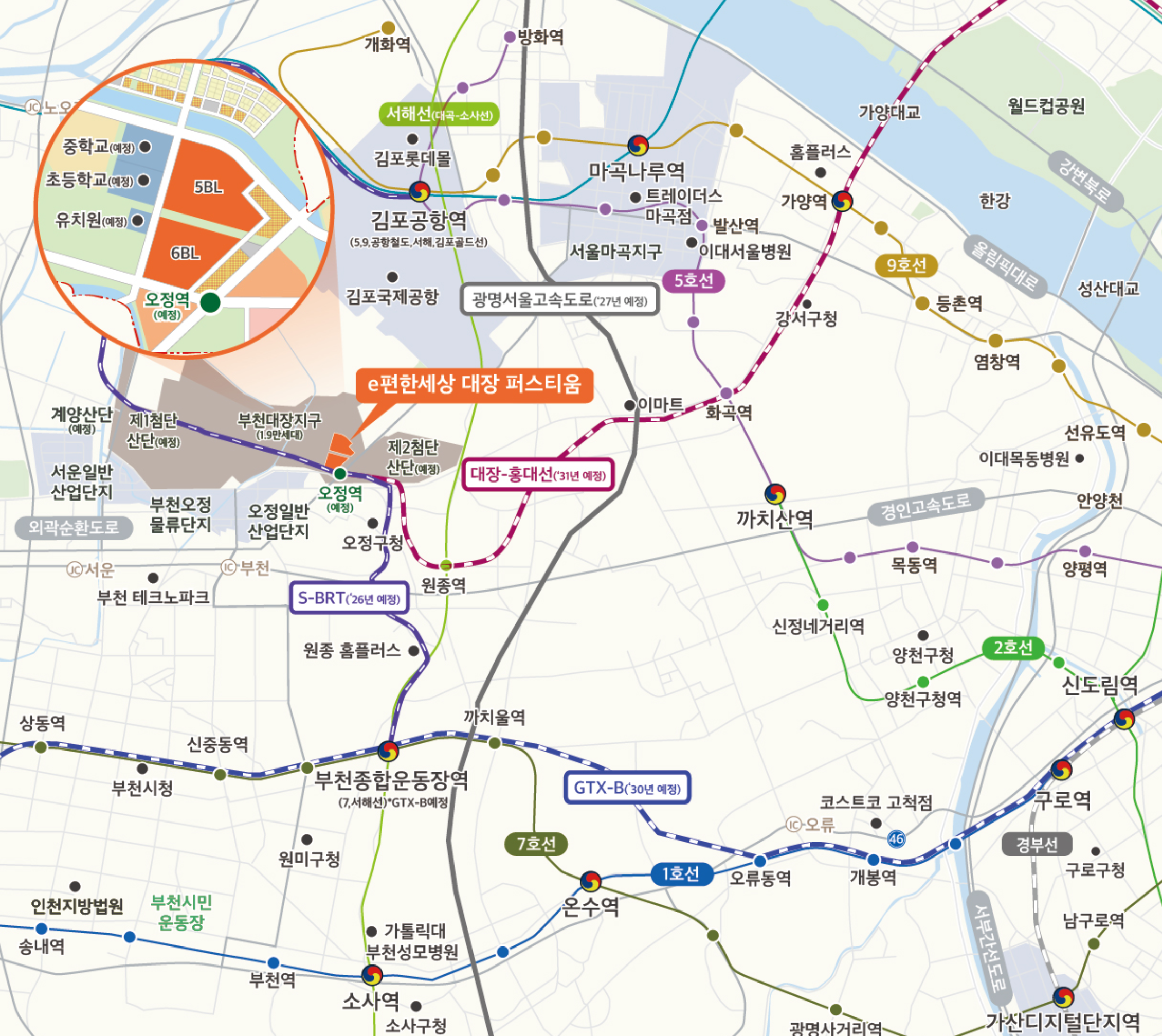 부천 대장신도시는 뛰어난 교통 호재와 함께 수도권 서부의 핵심 신도시로 급부상하고 있습니다. 특히 2031년 개통 예정인 지하철 대장-홍대선(오정역)이 완공되면 초역세권 아파트가 되며 서울 주요 도심까지 약 20분대 진입이 가능해질 전망입니다. 또한 GTX-D 노선 계획이 추진되고 있으며, 친환경적이고 효율적인 도심교통체계인 S-BRT(슈퍼 간선급행버스) 도입도 계획 중입니다. 이와 함께 약 30만 평 규모의 공원과 녹지를 조성하는 등 생활편의 인프라까지 대폭 확충돼 장기적인 부동산 가치 상승이 매우 기대되는 지역입니다.